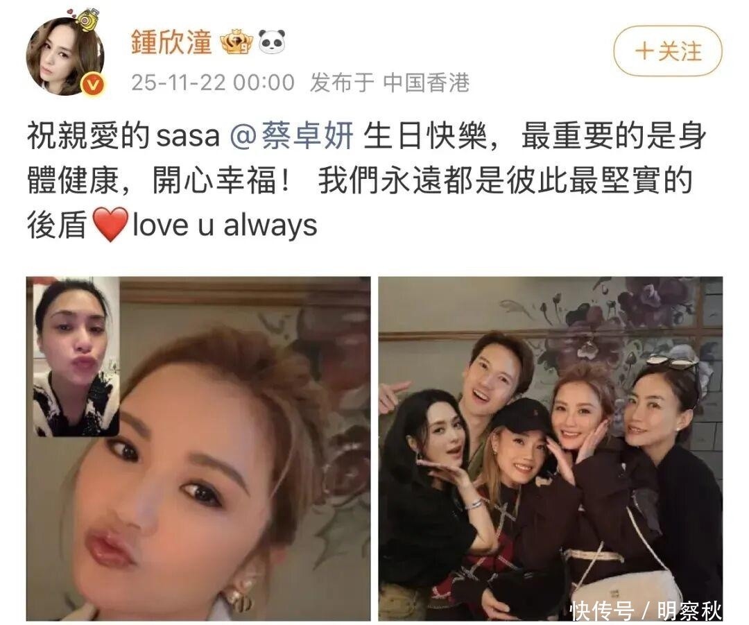 而钟欣潼在11月22日0:00分卡点为好姐妹送上生日祝福,并配文“身体健康,开心幸福”,并强调“彼此是最坚实的后盾”,文末附“love u always”。